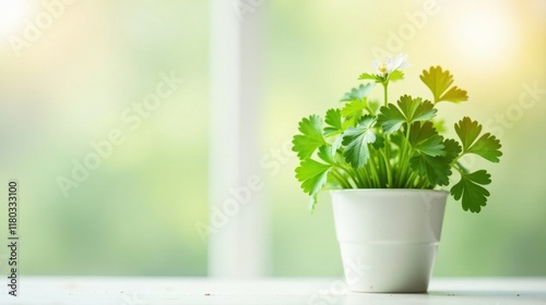 Vibrant Green Parsley Plant in a White Pot on a Windowsill