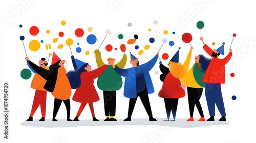 vibrant group of cartoon characters celebrating with colorful confetti and balloons, showcasing joy and excitement in festive atmosphere