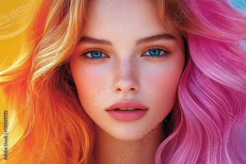 Vibrant hair color transformation with artistic flair in a colorful backdrop