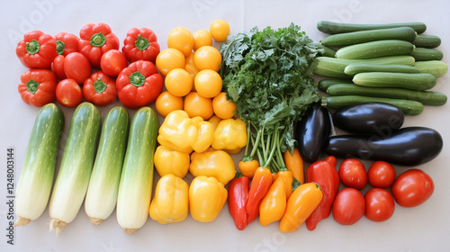 Vibrant Harvest: A still life featuring an array of fresh vegetables in various shades of red, yellow, and green, arranged in rows on a neutral surface.