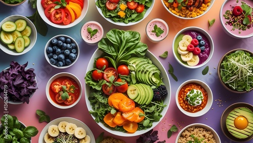 health food, salad, fruit, vegetable, bowl, vibrant, colourful, fresh, food, nourishment, diet, wellness, ingredient, arrangement, table, topview, meal, eating, organic, natural, epicure, cookery, dish, assortment, still life, background, design, art, creative, illustration, photo, style, culinary, gourmet food, health, lifestyle, vegetarian, vegan, balanced diet, food photography, healthy eating