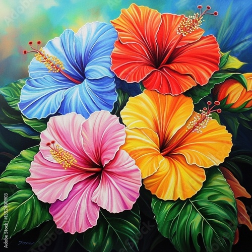 hibiscus, flower, colourful, vibrant, flower petals, art, painting, floral, nature, blossom, bright, colours, design, spring, summer, tropical, garden, beauty, decoration, high-coloured, artistic, detail, closeup, illustration, impressionism, impressionistic, flower, leaf, green, yellow, pink, red, blue, orange, image, blooming, artwork, drawing