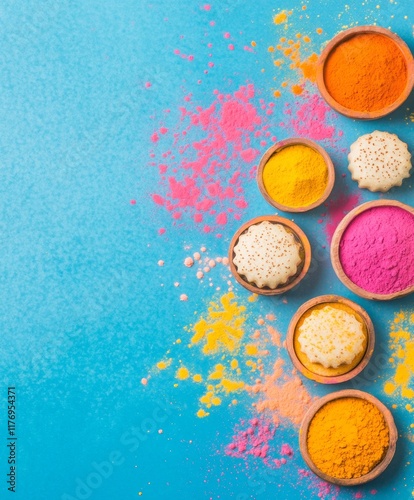 Vibrant Holi Festival Sweets and Colors on Blue Background