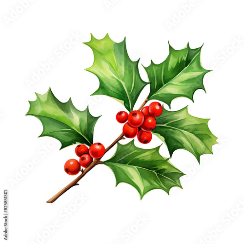 Vibrant holly branch with green leaves and red berries, symbolizing festive holiday decoration and classic Christmas tradition.