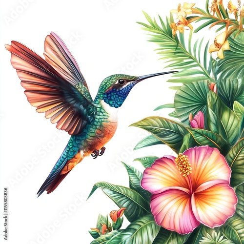Vibrant Hummingbird Hovering Near Tropical Flower with Lush Vegetation
