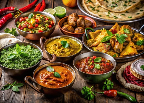 Vibrant Indian Feast: Spicy Curries, Naan, & Grilled Chicken