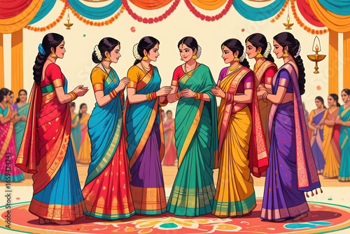 Vibrant indian women in traditional sarees gathered at a festive celebration