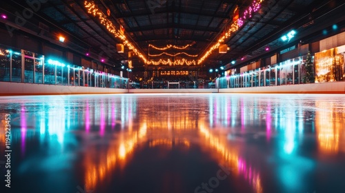 Vibrant Indoor Ice Skating Rink with Colorful Lights and Reflections, Perfect for Promoting Winter Activities