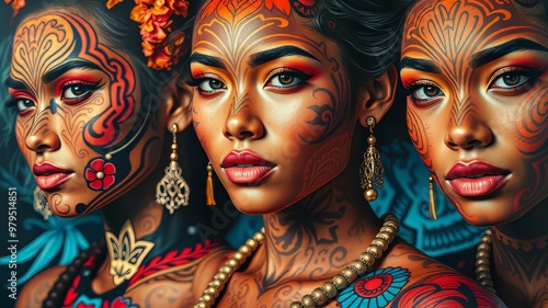 Vibrant, intricately designed Polynesian patterns adorn the skin, featuring swirling spirals, geometric shapes, and