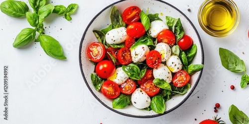 Vibrant Italian vegan salad with fresh mozzarella tomatoes and basil arranged in a bowl with olive oil in the background on a white surface.