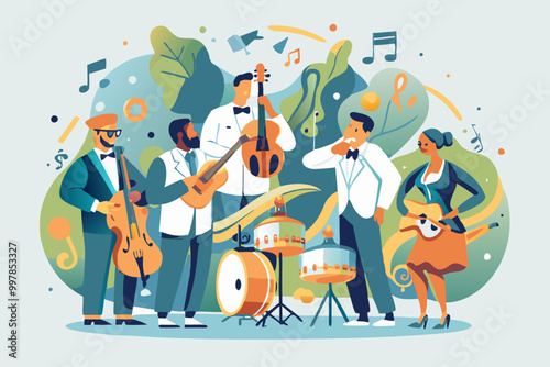 jazz, band, performance, musician, dancer, vibrant, dynamic, music, instrument, saxophone, trumpet, double bass, drum, playback, swing, live, concert, entertainment, rythm, blues, festive, illustration, art, style, flat, design, modern, cultural, event, harmony, ensemble, groove, melody, beat, party, celebration, abstract, graphic, colourful, energetic, retro, sound, fun, audience, stage, show, energy, vector