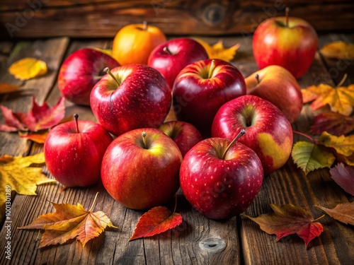 Vibrant, juicy red apples spill across a rustic wooden table, creating a warm and inviting seasonal background with