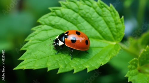 Vibrant ladybug explores a dew-kissed leaf in nature's embrace.