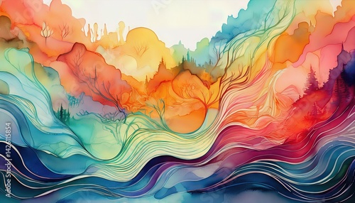 Vibrant Layered Abstraction A Rhapsody of Color and Texture in a Watercolor Masterpiece, Evoking Emotions through the Interplay of Waves, Swirls, and Rich Hues.