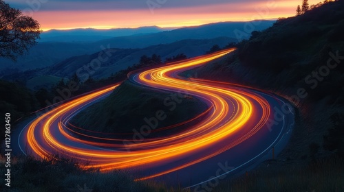 Vibrant Light Trails on Winding Mountain Road at Sunset