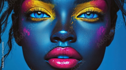 woman, face, make-up, colourful, vibrant, blue, yellow, pink, purple, glistering, eyeshadow, eyelash, lip, glossy, skin, dark, model, beauty, fashion, portrait, artistic, creative, expression, intense, dramatic, striking, bold, elegant, mysterious, captivating