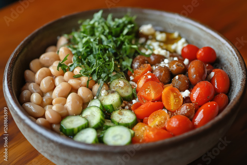 vibrant mediterranean-inspired white bean bowl artfully arranged with fresh tomatoes, cucumbers, and a generous sprinkle of feta cheese, garnished with green herbs
