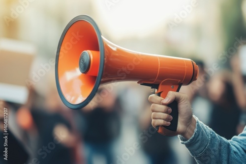 megaphone, loudspeaker, protest, demonstration, activism, communication, voice, crowd, speaker, street, orange, authority, rally, announcement, message, clarity, sharpened, urgency, power, engagement, passion, event, noise, sound, visibility, attention, expression, leadership, messaging, connection, encouragement, support, researching, demand, oneness, influence, interaction, energy, advocacy, awareness, change, participation, organisation, movement