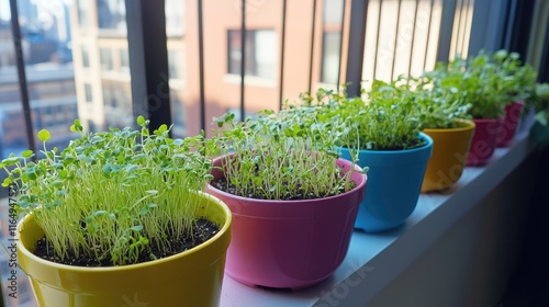 Vibrant microgreens in colorful pots arranged on a balcony with urban backdrop and natural sunlight enhancing their growth