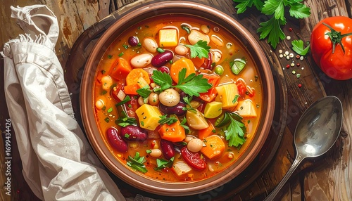minestrone, soup, vegetable, bean, healthy, vegetarian, vegan, tomatoes, parsley, broth, rustic, wood, bowl, spoon, tablecloth, meal, dinner, lunch, dish, food, cookery, italian, comfort food, colourful, alimentary, fresh, homemade, delicious, tasty, cooked, epicure, culinary, ingredient, receipe, topview, still life, artistic, presentation, warm, autumn, winter, seasonal, nourishing, wholesome, natural, organic, garden