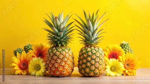 Vibrant Minimalist Tropical Paradise with Yellow Pineapples and Colorful Flowers for Fresh Decor Inspiration