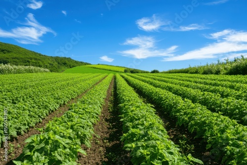 Vibrant mint field in full bloom rural location nature photography sunny environment wide-angle viewpoint agricultural concept