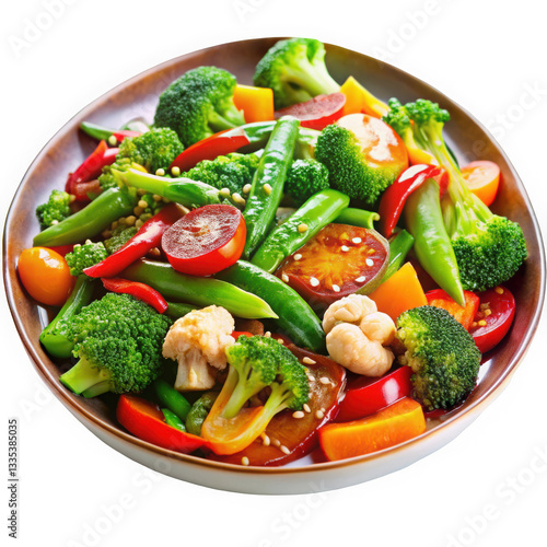 Vibrant mixed vegetable stir-fry with broccoli, bell peppers, and snap peas, garnished with sesame seeds.