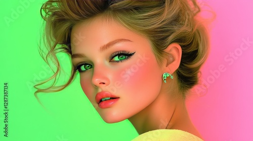 woman, neon, make-up, vibrant, portrait, fashion, colourful, trendy, modern, beauty, coiffure, artistic, bright, stylish, green, pink, elegance, expression, glamour, detail, soft, feminine, chic, glowing, allure, model, face, lip, eye, digital, enchanting, high-coloured, aesthetic, youthful, innovative, design, striking, look, creative, bold, contemporary, light, radiant