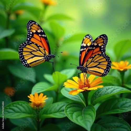 Vibrant monarch butterflies on lush green foliage, invertebrate, close-up, exotic