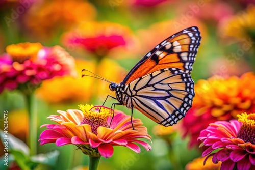 Vibrant Monarch Butterfly on Zinnia Flower in a Colorful Garden