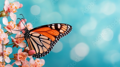 Vibrant Monarch Butterfly Resting on Soft Pink Flowers Against Blue