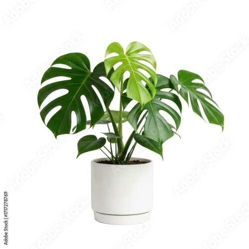 Vibrant Monstera Deliciosa with fenestrated green leaves in a minimalist white pot, isolated on a transparent background. Modern biophilic design concept.