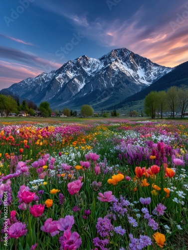 mountain, meadow, flower, colours, dawn, sky, cloud, snow, tree, landscape, spring, nature, scenic, sunrise, vale, peaceful, beautiful, blooming, colourful, wildflower, lush