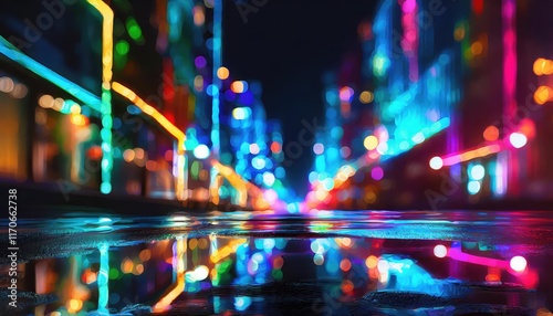 Vibrant MultiColored Neon Lights Illuminate a Dark City Street, Creating a Stunning Reflection in Puddles and Wet Surfaces, Capturing the Essence of Urban Nightlife and Modern Aesthetics