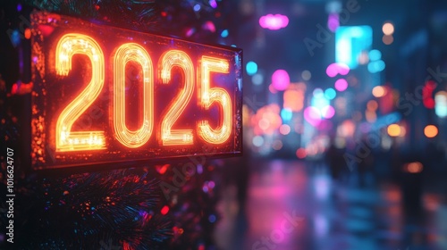 Vibrant neon 2025 in orange and pink, set against a softly blurred festival scene, evoking a festive and energetic atmosphere