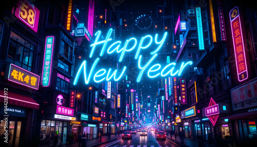 Vibrant Neon Cityscape Happy New Year Celebration Night Lights