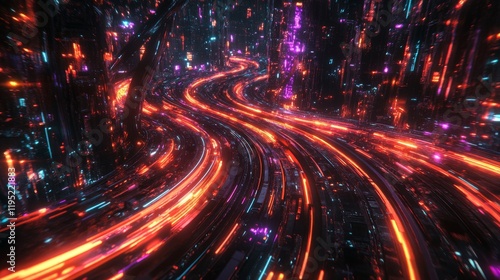 Vibrant Neon Cityscape with Flowing Light Trails through Futuristic Urban Environment, Capturing Dynamic Energy and Technological Vibes in a Digital Realm