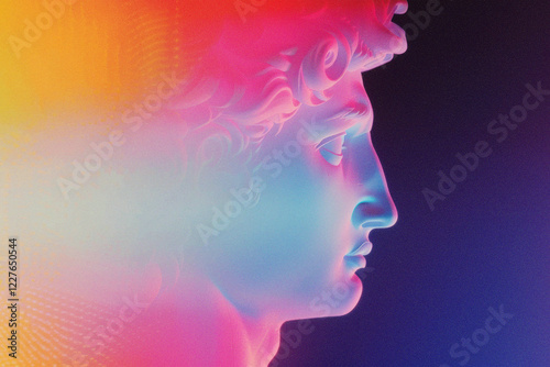sculpture, head, neon, glow, classical, statue, art, vibrant, futuristic, aesthetic, illustration, surreal, illumination, modern, digital, colourful, fantasy, elegant, ancient, renaissance, greek, roman, abstract, creative, glowing, visionary, contemporary, silhouette, face, profile, fashion, concept, person
