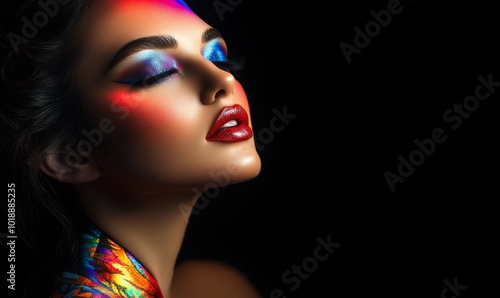 Vibrant neon makeup on woman’s face with colorful glitter and glowing effect
