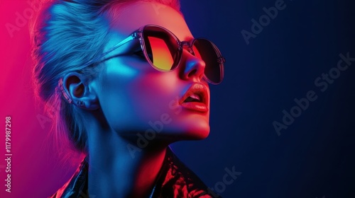Vibrant neon portrait, woman wearing aviator sunglasses, blue and pink lighting, dramatic contrasts, 80s retro aesthetic, cyberpunk style, high fashion, close-up shot, glossy lips, intense colors, ref