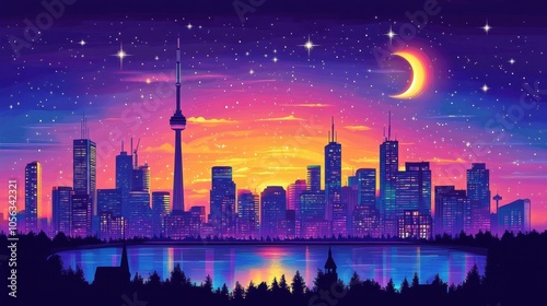 city, skyline, night, star, moon, twilight, colourful, horizon, water, urban, architecture, nature, peaceful, glowing, travel, landscape, light, scenic, beautiful, evening, silhouette, calmness, visual, modern, building, illumination, panorama, sky, cloud, serene, view, space, environment, culture, tour tourism, exploration, adventure, vacation, artistic, aesthetic, creative, design, skyward, dusk, luminance, scene