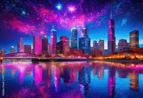 vibrant nighttime reflections luminous city skyline showcasing colorful buildings sparkling lights, water, illuminated, urban, architecture, landscape