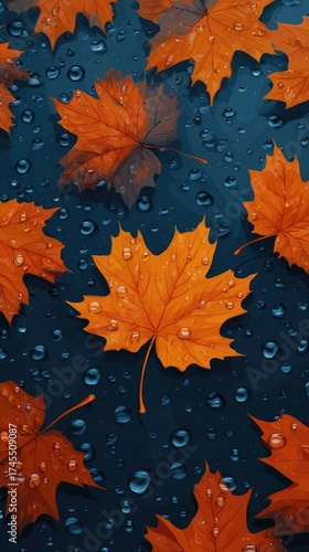 autumn, fall, leaf, maple, orange, red, wet, water, droplet, dark, background, surface, closeup, vertical, nature, season, colourful, vibrant, glossy, shiny, texture, detail, design, wallpaper, image, photo, graphic, illustration, beauty, aesthetic, rich, hue, tone, contrast, pattern, arrangement, scattered, display, composition, element, scene, view, sight, striking, high-coloured, intense, natural