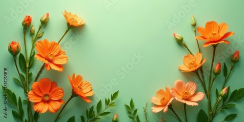 Vibrant Orange Blossoms Arranged Symmetrically on a Soft Green Background, Creating a Delicate and Elegant Floral Composition Perfect for Springtime Greetings or Festive Celebrations