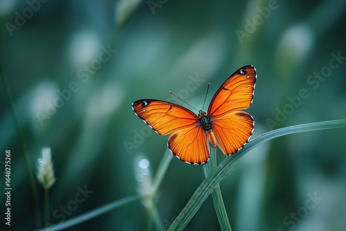 vibrant orange butterfly with outstretched wings resting on a green grass blade in a blurred natural setting