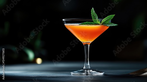 Vibrant orange cocktail in a martini glass, garnished with fresh mint leaves, presented on a dark surface