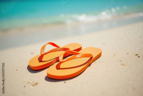 Vibrant orange flip-flops on a sandy beach with turquoise ocean waves in the background, symbolizing summer travel, tropical vacation, relaxation, and beach lifestyle essentials