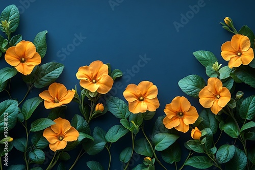 Vibrant Orange Flowers and Lush Green Leaves on Blue Background