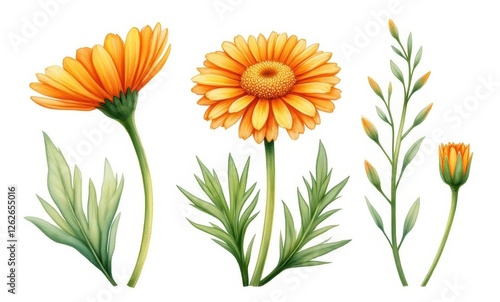 orange flower, nature, yellow, daisy, calendula, green leaf, summer flowers, hand-drawn, plant, flower petals, creative, garden, wildflower, beautiful, fresh, growth, bloom, elegant, simple, bright, natural beauty, flowering plant, inspiration, craft, artwork, color palette, peaceful, charming, sunny, cheerful, freshness, scenic