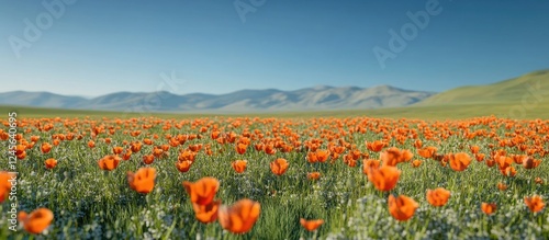 Vibrant orange mountain poppies in a lush green field under a clear blue sky with distant mountains creating a serene picturesque landscape.